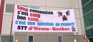 Réunis en assemblée général ce matin, les techniciennes et techniciens de laboratoire, les assistantes et assistants techniques de laboratoire et les travailleuses et travailleurs d’Héma-Québec à Montréal, ont voté à 99 % un mandat de grève générale illimitée à utiliser au moment jugé opportun.