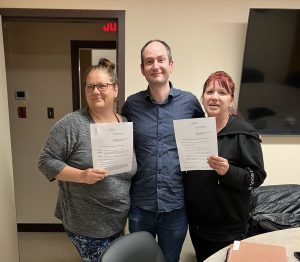 Sur la photo on retrouve de gauche à droite : Marie-Ève Lamothe (membre du comité de négociation), David Julien (conseiller syndical), Linda Ouellet (membre du comité de négociation et présidente du syndicat).